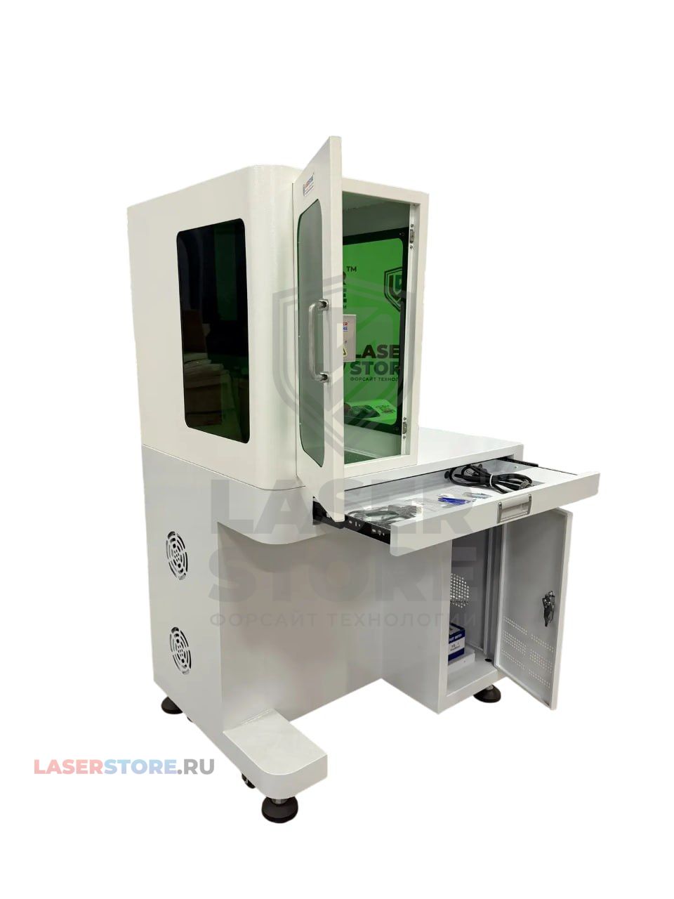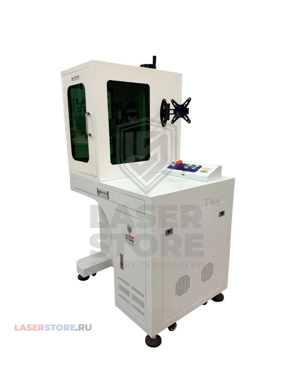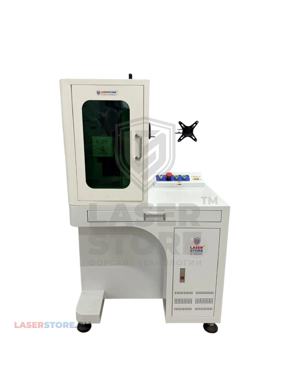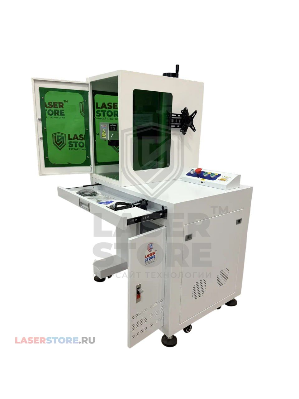 Лазерный маркер TORWATT FLM WP CABIN имеет компактный и вместительный корпус, в котором имеется выдвижной отсек для клавиатуры и компьютерной мыши, также в корпусе можно разместить системный блок. Монитор крепится на кронштейн на уровне глаз для удобства работы.